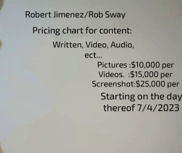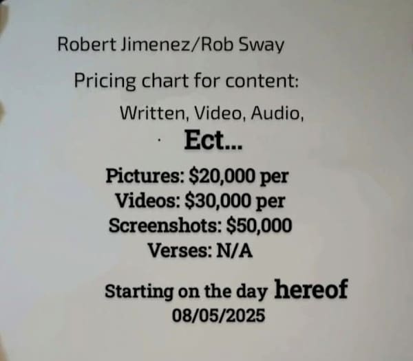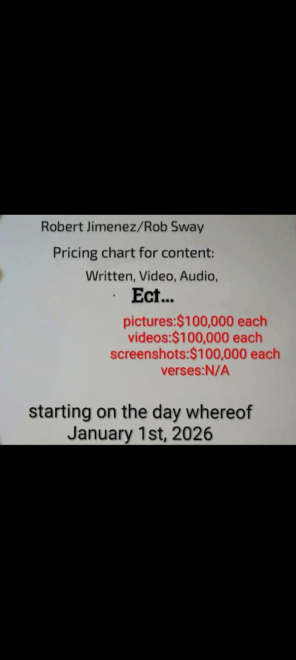 Pricing is as listed above. Any and all projects, ideas, images, videos, audio files, words, and events are all property of RobsSwayPublishing and are protected by federal and state copyright and piracy laws and guidelines. Duplication or any sort of non authorized use or possession is strictly prohibited and will be prosecuted and persecuted to the full extent of my laws and or state and federal laws.